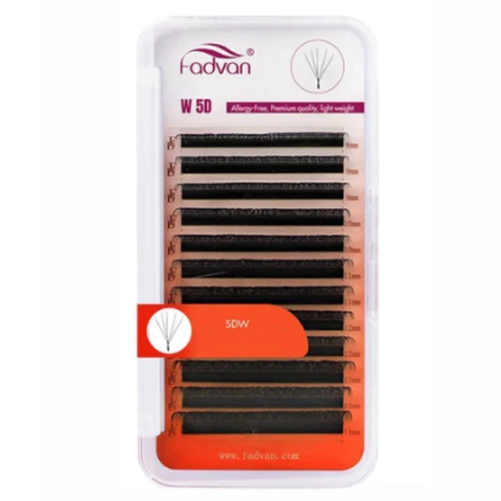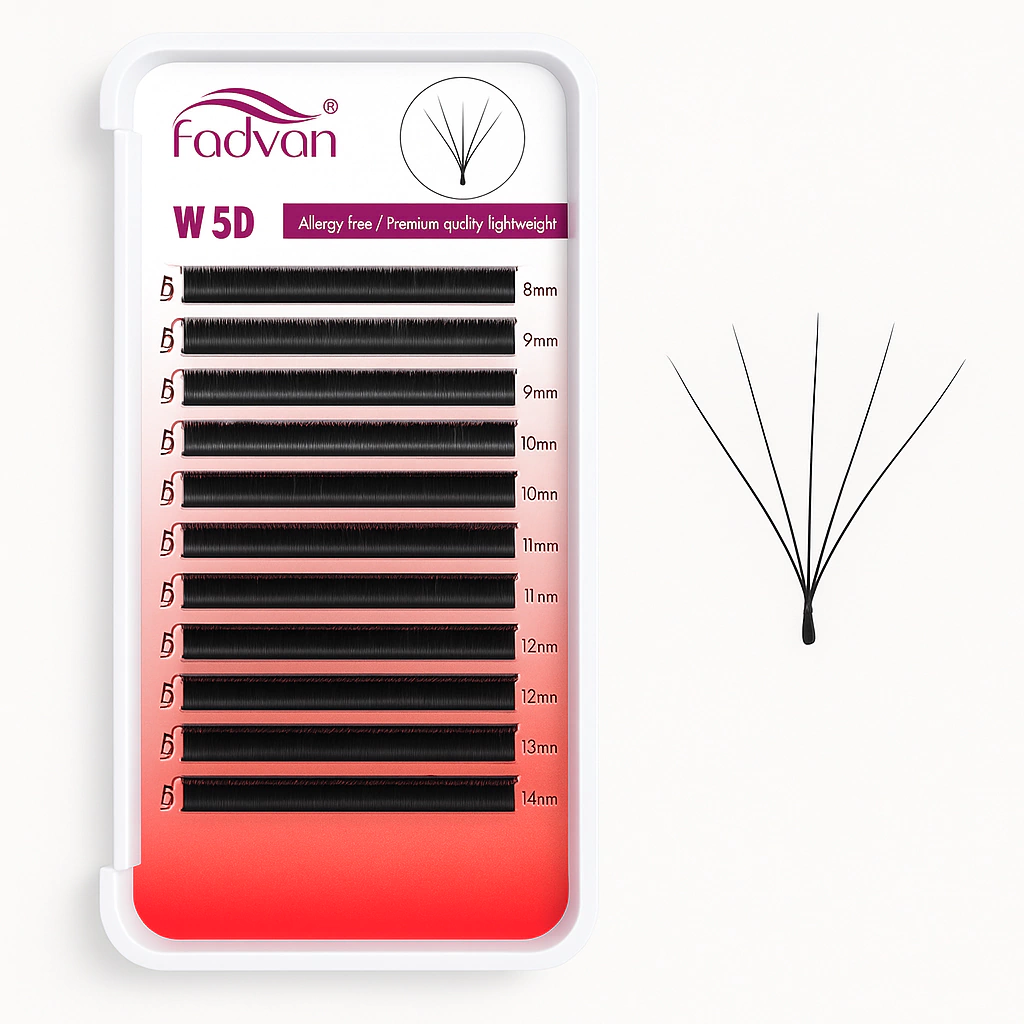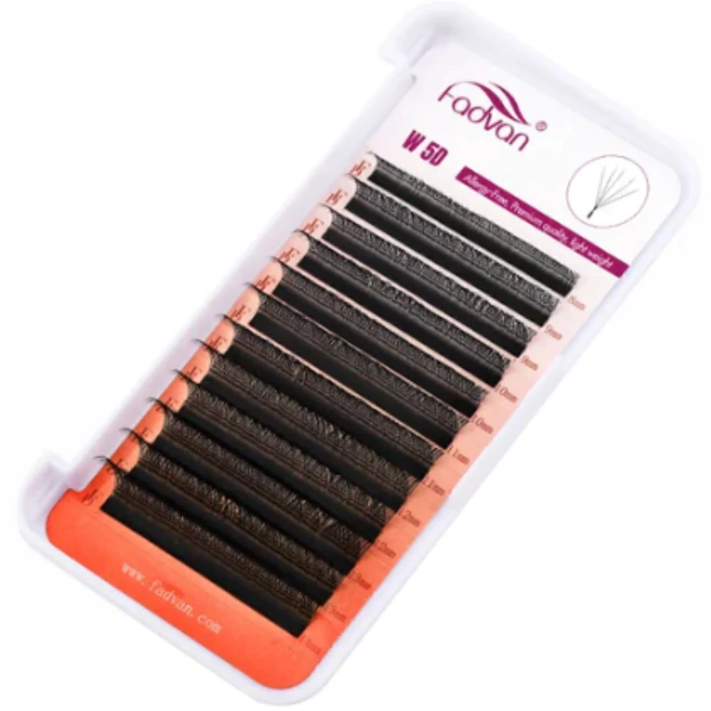 Cílios no formato W com volume 5D (cinco fios ultrafinos unidos na base), ideais para criar um efeito volumoso, equilibrado e sofisticado. A base em formato W proporciona maior área de contato com a cola, garantindo fixação mais firme e duradoura, além de facilitar a aplicação e manter o alinhamento perfeito dos fios.